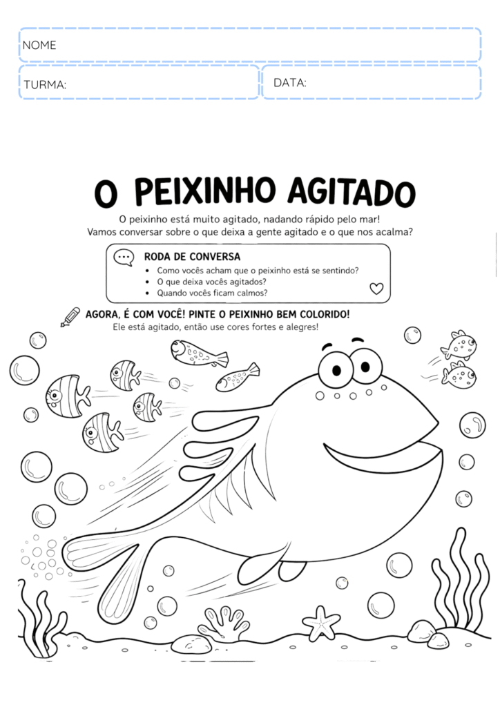 O livro “O Peixinho Agitado“ é uma excelente ferramenta para trabalhar com crianças da Educação Infantil, especialmente para desenvolver habilidades socioemocionais como controle das emoções, calma, respiração e autocontrole. A história aborda um peixinho que está sempre agitado e aprende, ao longo da narrativa, a se acalmar.